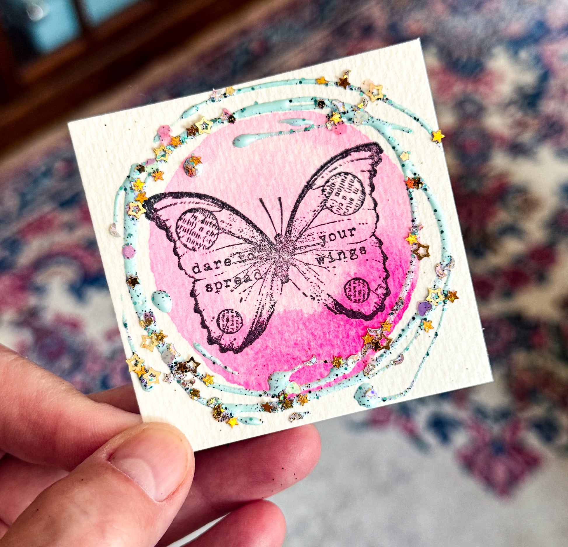 Hand-painted with dreamy pink watercolor, each 3x3-inch card features a stamped butterfly and the gentle reminder: