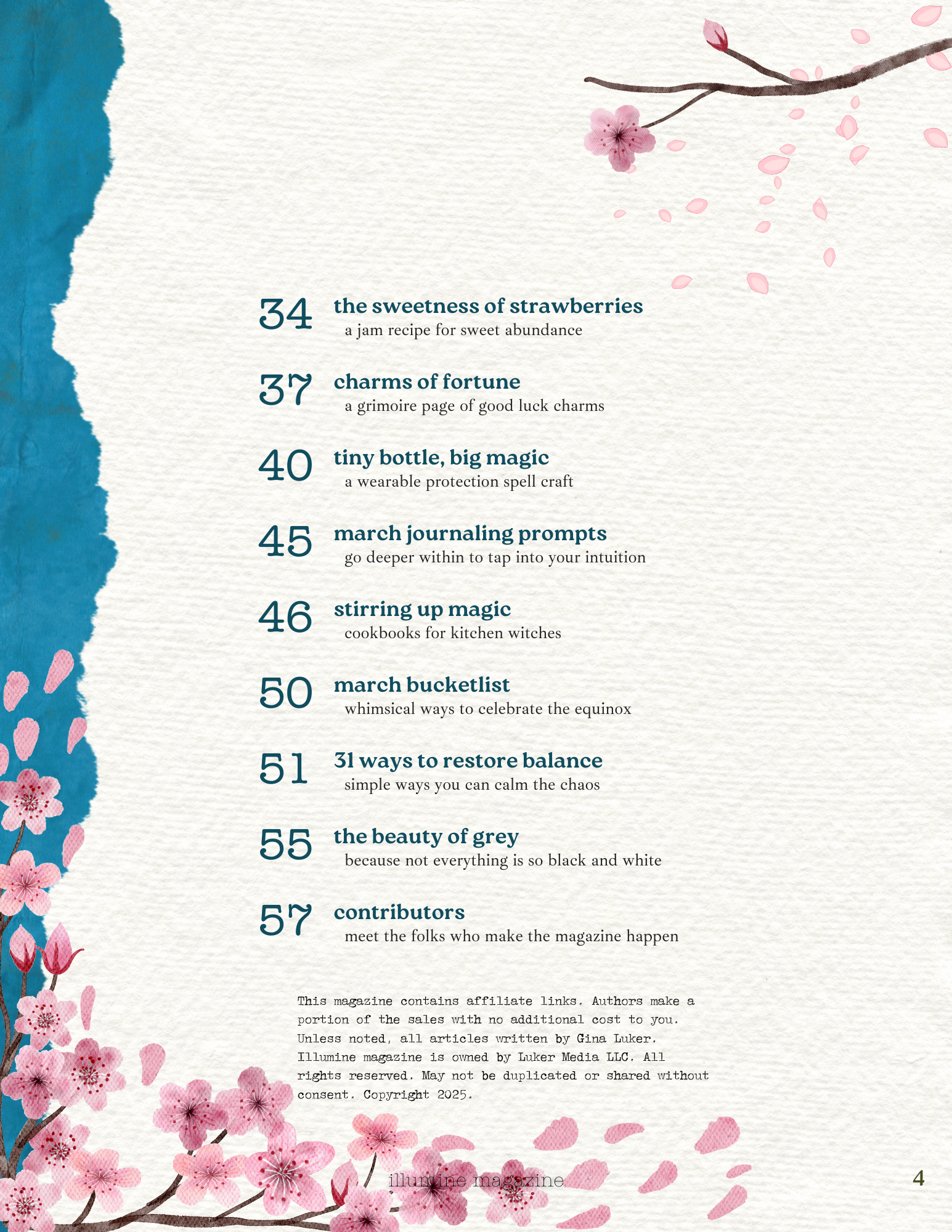 Illumine Magazine is a beautifully crafted digital lifestyle magazine that blends magic, mindfulness, and cozy living. Each issue is filled with inspiring DIY projects, seasonal rituals, journaling prompts, book recommendations, and wellness tips to help you infuse everyday life with intention and enchantment. Whether you're seeking moments of calm, creative inspiration, or a deeper connection to yourself and the world around you, Illumine is your guide to making life magical. Written and published by Gina Luker, Luker Media LLC